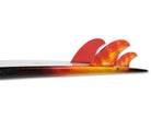 "The Evil Twin" is a twin fin + trailer combo developed not just for the "Evil Twin" board model, but for any boards that revel on twin fin flare. The template is an exact replica of our twin fins designed for our original RNF close to 25 years ago. A friend in Florida recently dug up an actual mid 90's pair of these hand foiled twins and sent them to me, claiming these large surface area fins relevance today. We immediately prototyped with Futures and loved them. An upright fin, with a swept back tip, and plenty of area. They provide drive and precise pivot. We paired them with a smaller than average trailer, which helps draw out turns and lends some stability and projection, yet retains that free feeling, twin fin feel. I recently used a prototype set on my step-ups, solid backside, overhead Indo surf, where I never thought a twin fin would perform so well, I would actually forget I was using them" -Mayhem