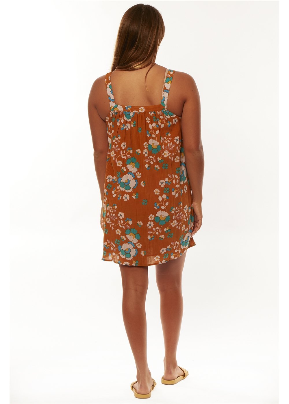 The Wind Star Dress, with its warm floral accents, possesses a flattering springtime energy. Assembled in a lightweight eco crinkle fabric, this mini tank dress has a square neck and front placket with buttons.