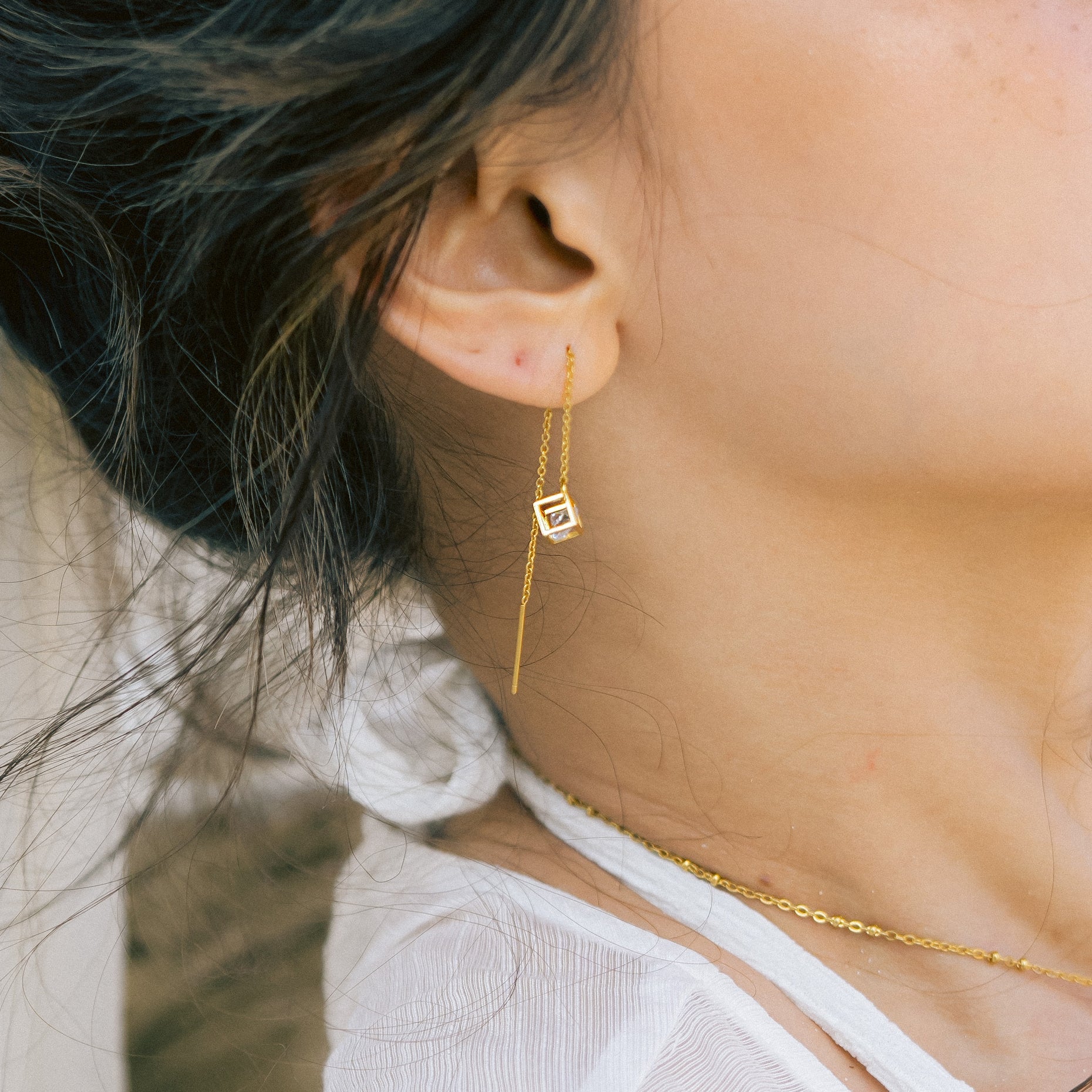 Treasures Zircon Charm Thread-Through Earrings is made of 18k gold-plated brass charm with zircon stone and 18k gold-plated stainless steel thread-through earrings.
